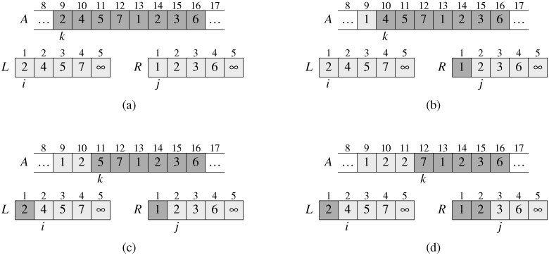 In detail, the MERGE procedure works as follows. Line 1 computes the length n1 of the subarray A[p ‥ q], and line 2 computes the length n2 of the subarray A[q + 1 ‥ r]. We create arrays L and R ("left" and "right"), of lengths n1 + 1 and n2 + 1, respectively, in line 3. The for loop of lines 4-5 copies the subarray A[p ‥ q] into L[1 ‥ n1], and the for loop of lines 6-7 copies the subarray A[q + 1 ‥ r] into R[1 ‥ n2]. Lines 8-9 put the sentinels at the ends of the arrays L and R. Lines 10-17, illustrated in Figure 2.3, perform the r - p + 1 basic steps by maintaining the following loop invariant: