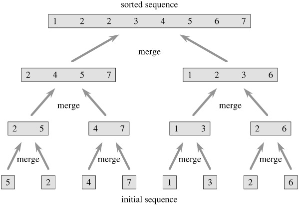 To sort the entire sequence A = 〈A[1], A[2], . . . , A[n]〉, we make the initial call MERGE-SORT(A, 1, length[A]), where once again length[A] = n. Figure 2.4 illustrates the operation of the procedure bottom-up when n is a power of 2. The algorithm consists of merging pairs of 1-item sequences to form sorted sequences of length 2, merging pairs of sequences of length 2 to form sorted sequences of length 4, and so on, until two sequences of length n/2 are merged to form the final sorted sequence of length n.