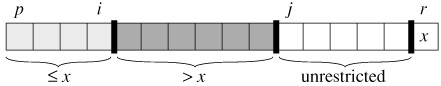 Figure 7.2 summarizes this structure. The indices between j and r - 1 are not covered by any of the three cases, and the values in these entries have no particular relationship to the pivot x.