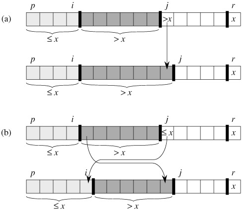 Figure 7.3: The two cases for one iteration of procedure PARTITION. (a) If A[j] > x, the only action is to increment j, which maintains the loop invariant. (b) If A[j] ≤ x, index i is incremented, A[i] and A[j] are swapped, and then j is incremented. Again, the loop invariant is maintained.