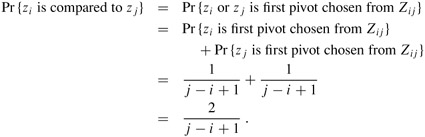 In general, once a pivot x is chosen with zi < x < zj, we know that zi and zj cannot be compared at any subsequent time. If, on the other hand, zi is chosen as a pivot before any other item in Zij, then zi will be compared to each item in Zij, except for itself. Similarly, if zj is chosen as a pivot before any other item in Zij, then zj will be compared to each item in Zij , except for itself. In our example, the values 7 and 9 are compared because 7 is the first item from Z7,9 to be chosen as a pivot. In contrast, 2 and 9 will never be compared because the first pivot element chosen from Z2,9 is 7. Thus, zi and zj are compared if and only if the first element to be chosen as a pivot from Zij is either zi or zj.
