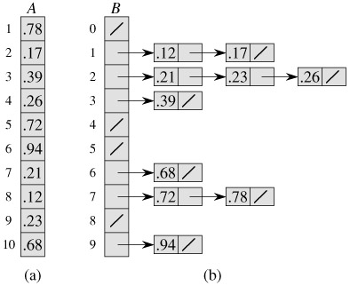 Our code for bucket sort assumes that the input is an n-element array A and that each element A[i] in the array satisfies 0 ≤ A[i] < 1. The code requires an auxiliary array B[0 ‥ n - 1] of linked lists (buckets) and assumes that there is a mechanism for maintaining such lists. (Section 10.2 describes how to implement basic operations on linked lists.)
