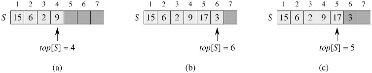 As shown in Figure 10.1, we can implement a stack of at most n elements with an array S[1, ‥ n]. The array has an attribute top[S] that indexes the most recently inserted element. The stack consists of elements S[1 ‥ top[S]], where S[1] is the element at the bottom of the stack and S[top[S]] is the element at the top.