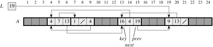 We can use the same strategy for implementing objects in programming environments that do not provide explicit pointer data types. For example, Figure 10.6 shows how a single array A can be used to store the linked list from Figures 10.3(a) and 10.5. An object occupies a contiguous subarray A[j ‥ k]. Each field of the object corresponds to an offset in the range from 0 to k - j, and a pointer to the object is the index j. In Figure 10.6, the offsets corresponding to key, next, and prev are 0, 1, and 2, respectively. To read the value of prev[i], given a pointer i, we add the value i of the pointer to the offset 2, thus reading A[i + 2].