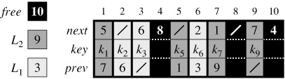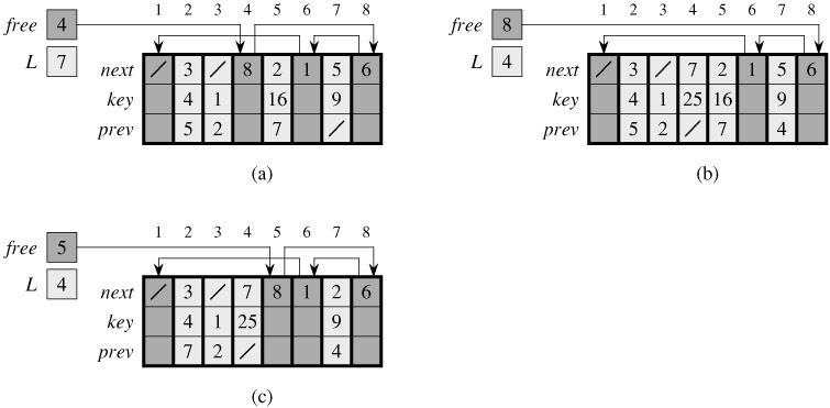 In Figure 10.3(a), the object with key 4 follows the object with key 16 in the linked list. In Figure 10.5, key 4 appears in key[2], and key 16 appears in key[5], so we have next[5] = 2 and prev[2] = 5. Although the constant NIL appears in the next field of the tail and the prev field of the head, we usually use an integer (such as 0 or -1) that cannot possibly represent an actual index into the arrays. A variable L holds the index of the head of the list.
