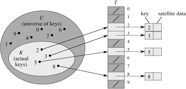To represent the dynamic set, we use an array, or direct-address table, denoted by T[0 ‥ m - 1], in which each position, or slot, corresponds to a key in the universe U . Figure 11.1 illustrates the approach; slot k points to an element in the set with key k. If the set contains no element with key k, then T[k] = NIL.