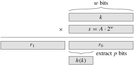An advantage of the multiplication method is that the value of m is not critical. We typically choose it to be a power of 2 (m = 2p for some integer p) since we can then easily implement the function on most computers as follows. Suppose that the word size of the machine is w bits and that k fits into a single word. We restrict A to be a fraction of the form s/2w, where s is an integer in the range 0 < s < 2w. Referring to Figure 11.4, we first multiply k by the w-bit integer s = A · 2w. The result is a 2w-bit value r12w + r0, where r1 is the high-order word of the product and r0 is the low-order word of the product. The desired p-bit hash value consists of the p most significant bits of r0.