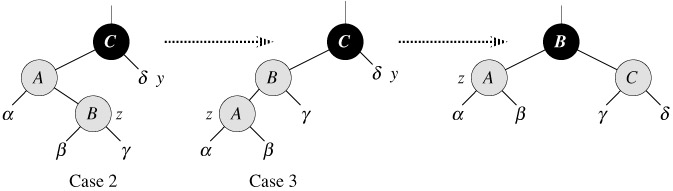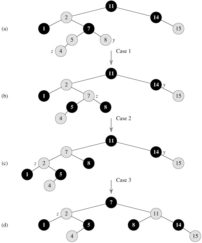 Now we show that cases 2 and 3 maintain the loop invariant. (As we have just argued, p[z] will be black upon the next test in line 1, and the loop body will not execute again.)