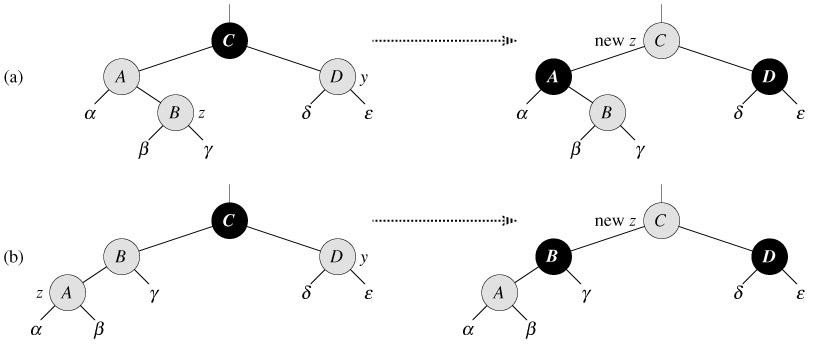 RB-INSERT-FIXUP(T, z) 1 while color[p[z]] = RED 2 do if p[z] = left[p[p[z]]] 3 then y ← right[p[p[z]]] 4 if color[y] = RED 5 then color[p[z]] ← BLACK ▹ Case 1 6 color[y] ← BLACK ▹ Case 1 7 color[p[p[z]]] ← RED ▹ Case 1 8 z ← p[p[z]] ▹ Case 1 9 else if z = right[p[z]] 10 then z ← p[z] ▹ Case 2 11 LEFT-ROTATE(T, z) ▹ Case 2 12 color[p[z]] ← BLACK ▹ Case 3 13 color[p[p[z]]] ← RED ▹ Case 3 14 RIGHT-ROTATE(T, p[p[z]]) ▹ Case 3 15 else (same as then clause with "right" and "left" exchanged) 16 color[root[T]] ← BLACK