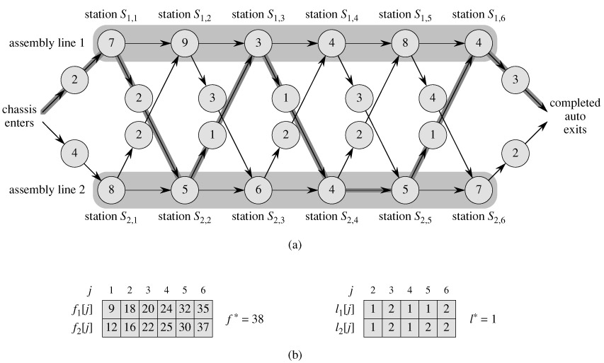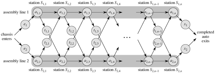 Our first example of dynamic programming solves a manufacturing problem. The Colonel Motors Corporation produces automobiles in a factory that has two assembly lines, shown in Figure 15.1. An automobile chassis enters each assembly line, has parts added to it at a number of stations, and a finished auto exits at the end of the line. Each assembly line has n stations, numbered j = 1, 2, ..., n. We denote the jth station on line i (where i is 1 or 2) by Si,j. The jth station on line 1 (S1,j) performs the same function as the jth station on line 2 (S2,j). The stations were built at different times and with different technologies, however, so that the time required at each station varies, even between stations at the same position on the two different lines. We denote the assembly time required at station Si,j by ai,j. As Figure 15.1 shows, a chassis enters station 1 of one of the assembly lines, and it progresses from each station to the next. There is also an entry time ei for the chassis to enter assembly line i and an exit time xi for the completed auto to exit assembly line i.