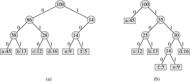 The decoding process needs a convenient representation for the prefix code so that the initial codeword can be easily picked off. A binary tree whose leaves are the given characters provides one such representation. We interpret the binary codeword for a character as the path from the root to that character, where 0 means "go to the left child" and 1 means "go to the right child." Figure 16.4 shows the trees for the two codes of our example. Note that these are not binary search trees, since the leaves need not appear in sorted order and internal nodes do not contain character keys.