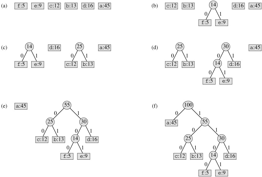 For our example, Huffman's algorithm proceeds as shown in Figure 16.5. Since there are 6 letters in the alphabet, the initial queue size is n = 6, and 5 merge steps are required to build the tree. The final tree represents the optimal prefix code. The codeword for a letter is the sequence of edge labels on the path from the root to the letter.