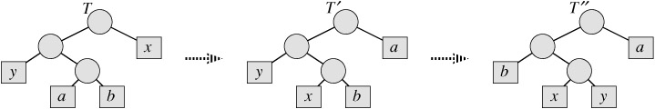 Let a and b be two characters that are sibling leaves of maximum depth in T. Without loss of generality, we assume that f[a] ≤ f[b] and f[x] ≤ f[y]. Since f[x] and f[y] are the two lowest leaf frequencies, in order, and f[a] and f[b] are two arbitrary frequencies, in order, we have f [x] ≤ f[a] and f[y] ≤ f[b]. As shown in Figure 16.6, we exchange the positions in T of a and x to produce a tree T′, and then we exchange the positions in T′ of b and y to produce a tree T′. By equation (16.5), the difference in cost between T and T′ is