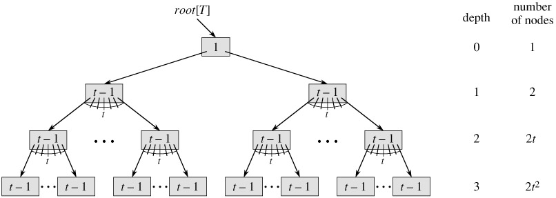 Proof If a B-tree has height h, the root contains at least one key and all other nodes contain at least t - 1 keys. Thus, there are at least 2 nodes at depth 1, at least 2t nodes at depth 2, at least 2t2 nodes at depth 3, and so on, until at depth h there are at least 2th-1 nodes. Figure 18.4 illustrates such a tree for h = 3. Thus, the number n of keys satisfies the inequality