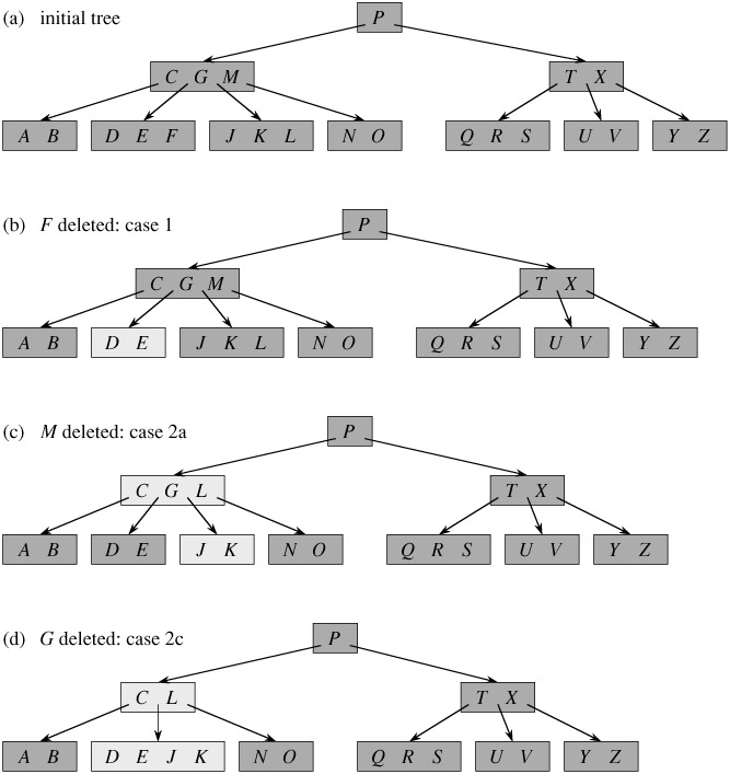 We sketch how deletion works instead of presenting the pseudocode. Figure 18.8 illustrates the various cases of deleting keys from a B-tree.