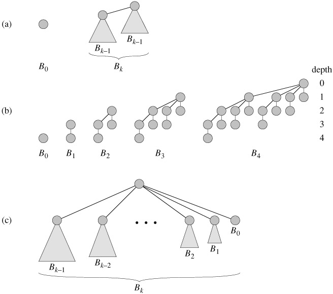 The binomial tree Bk is an ordered tree (see Section B.5.2) defined recursively. As shown in Figure 19.2(a), the binomial tree B0 consists of a single node. The binomial tree Bk consists of two binomial trees Bk-1 that are linked together: the root of one is the leftmost child of the root of the other. Figure 19.2(b) shows the binomial trees B0 through B4.