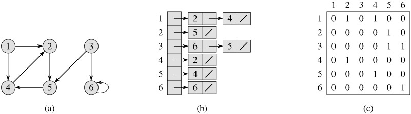 Figures 22.1(c) and 22.2(c) are the adjacency matrices of the undirected and directed graphs in Figures 22.1(a) and 22.2(a), respectively. The adjacency matrix of a graph requires Θ(V2) memory, independent of the number of edges in the graph.