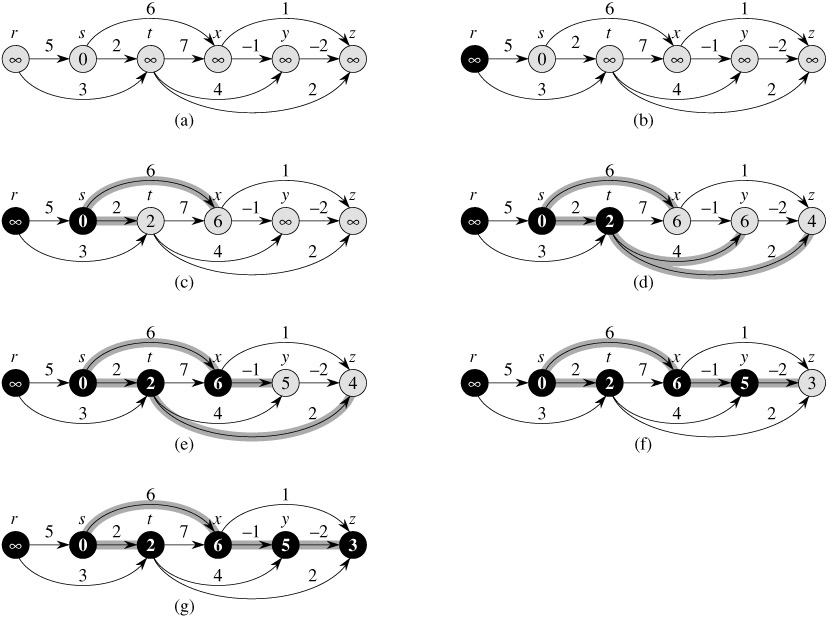By relaxing the edges of a weighted dag (directed acyclic graph) G = (V, E) according to a topological sort of its vertices, we can compute shortest paths from a single source in Θ(V + E) time. Shortest paths are always well defined in a dag, since even if there are negative-weight edges, no negative-weight cycles can exist.