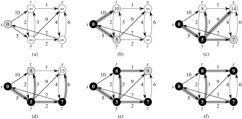 Dijkstra's algorithm solves the single-source shortest-paths problem on a weighted, directed graph G = (V, E) for the case in which all edge weights are nonnegative. In this section, therefore, we assume that w(u, v) ≥ 0 for each edge (u, v) ∈ E. As we shall see, with a good implementation, the running time of Dijkstra's algorithm is lower than that of the Bellman-Ford algorithm.