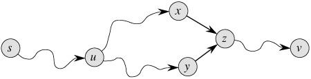 To complete the proof of the lemma, we must now show that for any vertex v ∈ Vπ, there is at most one path from s to v in the graph Gπ. Suppose otherwise. That is, suppose that there are two simple paths from s to some vertex v: p1, which can be decomposed into