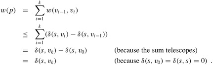 in Gπ is a shortest path from s to v in G. Let p = <v0, v1,..., vk>, where v0 = s and vk = v. For i = 1, 2,..., k, we have both d[vi ] = δ(s, vi) and d[vi] ≥ d[vi-1] + w(vi-1, vi), from which we conclude w(vi-1, vi) ≤ δ(s, vi) - δ(s, vi-1). Summing the weights along path p yields