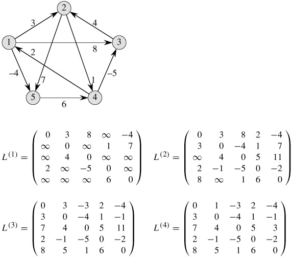 Figure 25.1 shows a graph and the matrices L(m) computed by the procedure SLOW-ALL-PAIRS-SHORTEST-PATHS.