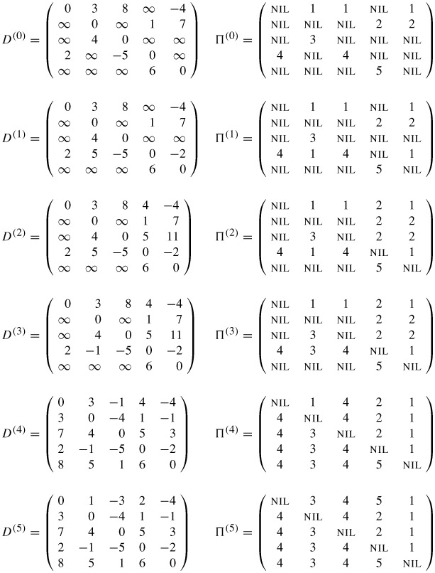 Figure 25.4 shows the matrices D(k) computed by the Floyd-Warshall algorithm for the graph in Figure 25.1.