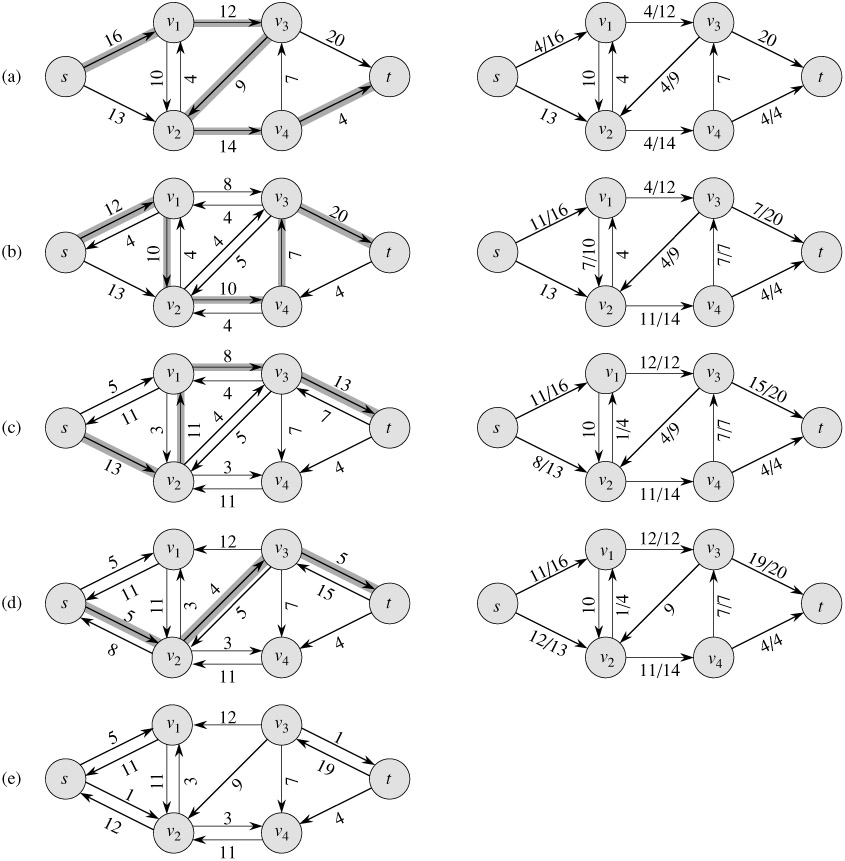 The FORD-FULKERSON algorithm simply expands on the FORD-FULKERSON-METHOD pseudocode given earlier. Figure 26.5 shows the result of each iteration in a sample run. Lines 1-3 initialize the flow f to 0. The while loop of lines 4-8 repeatedly finds an augmenting path p in Gf and augments flow f along p by the residual capacity cf (p). When no augmenting paths exist, the flow f is a maximum flow.