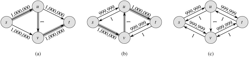 When the capacities are integral and the optimal flow value | f*| is small, the running time of the Ford-Fulkerson algorithm is good. Figure 26.6(a) shows an example of what can happen on a simple flow network for which | f*| is large. A maximum flow in this network has value 2,000,000: 1,000,000 units of flow traverse the path s → u → t, and another 1,000,000 units traverse the path s → v → t. If the first augmenting path found by FORD-FULKERSON is s → u → v → t, shown in Figure 26.6(a), the flow has value 1 after the first iteration. The resulting residual network is shown in Figure 26.6(b). If the second iteration finds the augmenting path s → v → u → t, as shown in Figure 26.6(b), the flow then has value 2. Figure 26.6(c) shows the resulting residual network. We can continue, choosing the augmenting path s → u → v → t in the odd-numbered iterations and the augmenting path s → v → u → t in the even-numbered iterations. We would perform a total of 2,000,000 augmentations, increasing the flow value by only 1 unit in each.