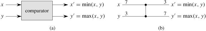 Sorting networks are comparison networks that always sort their inputs, so it makes sense to begin our discussion with comparison networks and their characteristics. A comparison network is composed solely of wires and comparators. A comparator, shown in Figure 27.1(a), is a device with two inputs, x and y, and two outputs, x' and y', that performs the following function: