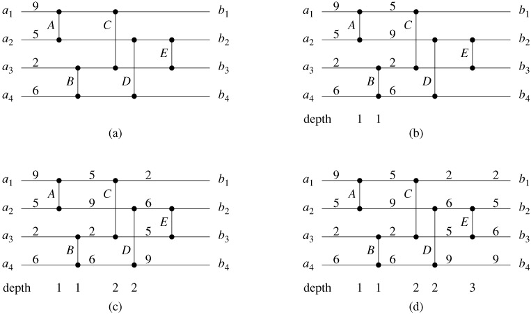 Under the assumption that each comparator takes unit time, we can define the "running time" of a comparison network, that is, the time it takes for all the output wires to receive their values once the input wires receive theirs. Informally, this time is the largest number of comparators that any input element can pass through as it travels from an input wire to an output wire. More formally, we define the depth of a wire as follows. An input wire of a comparison network has depth 0. Now, if a comparator has two input wires with depths dx and dy, then its output wires have depth max(dx, dy) + 1. Because there are no cycles of comparators in a comparison network, the depth of a wire is well defined, and we define the depth of a comparator to be the depth of its output wires. Figure 27.2 shows comparator depths. The depth of a comparison network is the maximum depth of an output wire or, equivalently, the maximum depth of a comparator. The comparison network of Figure 27.2, for example, has depth 3 because comparator E has depth 3. If each comparator takes one time unit to produce its output value, and if network inputs appear at time 0, a comparator at depth d produces its outputs at time d; the depth of the network therefore equals the time for the network to produce values at all of its output wires.