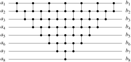 A wire transmits a value from place to place. Wires can connect the output of one comparator to the input of another, but otherwise they are either network input wires or network output wires. Throughout this chapter, we shall assume that a comparison network contains n input wires a1, a2,...,an, through which the values to be sorted enter the network, and n output wires b1, b2,...,bn, which produce the results computed by the network. Also, we shall speak of the input sequence 〈a1, a2,...,an〉 and the output sequence 〈b1, b2,...,bn〉, referring to the values on the input and output wires. That is, we use the same name for both a wire and the value it carries. Our intention will always be clear from the context.