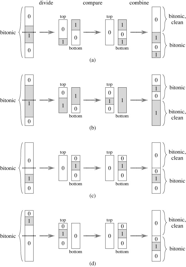 When a bitonic sequence of 0's and 1's is applied as input to a half-cleaner, the half-cleaner produces an output sequence in which smaller values are in the top half, larger values are in the bottom half, and both halves are bitonic. In fact, at least one of the halves is clean-consisting of either all 0's or all 1's-and it is from this property that we derive the name "half-cleaner." (Note that all clean sequences are bitonic.) The next lemma proves these properties of half-cleaners.