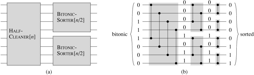 The bitonic sorter that we shall construct is a comparison network that sorts bitonic sequences of 0's and 1's. Exercise 27.3-6 asks you to show that the bitonic sorter can sort bitonic sequences of arbitrary numbers.
