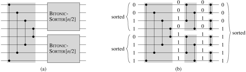 Our sorting network will be constructed from merging networks, which are networks that can merge two sorted input sequences into one sorted output sequence. We modify BITONIC-SORTER[n] to create the merging network MERGER[n]. As with the bitonic sorter, we shall prove the correctness of the merging network only for inputs that are zero-one sequences. Exercise 27.4-1 asks you to show how the proof can be extended to arbitrary input values.
