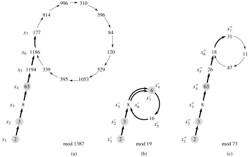 sequence repeats as soon as two elements of the sequence 〈xi〉 are merely equivalent modulo p, rather than equivalent modulo n. See Figure 31.7, parts (b) and (c), for an illustration.