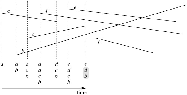 To be more precise, consider two segments s1 and s2. We say that these segments are comparable at x if the vertical sweep line with x-coordinate x intersects both of them. We say that s1 is above s2 at x, written s1 >x s2, if s1 and s2 are comparable at x and the intersection of s1 with the sweep line at x is higher than the intersection of s2 with the same sweep line. In Figure 33.4(a), for example, we have the relationships a >r c, a >t b, b >t c, a >t c, and b >u c. Segment d is not comparable with any other segment.