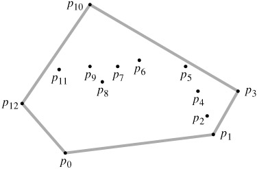 The convex hull of a set Q of points is the smallest convex polygon P for which each point in Q is either on the boundary of P or in its interior. (See Exercise 33.1-5 for a precise definition of a convex polygon.) We denote the convex hull of Q by CH(Q). Intuitively, we can think of each point in Q as being a nail sticking out from a board. The convex hull is then the shape formed by a tight rubber band that surrounds all the nails. Figure 33.6 shows a set of points and its convex hull.