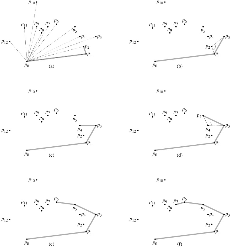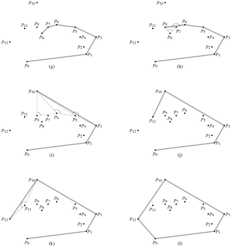 The remainder of the procedure uses the stack S. Lines 3-5 initialize the stack to contain, from bottom to top, the first three points p0, p1, and p2. Figure 33.7(a) shows the initial stack S. The for loop of lines 6-9 iterates once for each point in the subsequence 〈p3, p4, ..., pm〉. The intent is that after processing point pi , stack S contains, from bottom to top, the vertices of CH({ p0, p1, ..., pi}) in counterclockwise order. The while loop of lines 7-8 removes points from the stack if they are found not to be vertices of the convex hull. When we traverse the convex hull counterclockwise, we should make a left turn at each vertex. Thus, each time the while loop finds a vertex at which we make a nonleft turn, the vertex is popped from the stack. (By checking for a nonleft turn, rather than just a right turn, this test precludes the possibility of a straight angle at a vertex of the resulting convex hull. We want no straight angles, since no vertex of a convex polygon may be a convex combination of other vertices of the polygon.) After we pop all vertices that have nonleft turns when heading toward point pi , we push pi onto the stack. Figures 33.7(b)-(k) show the state of the stack S after each iteration of the for loop. Finally, GRAHAM-SCAN returns the stack S in line 10. Figure 33.7(l) shows the corresponding convex hull.
