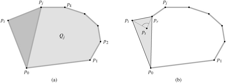 Figure 33.8: The proof of correctness of GRAHAM-SCAN. (a) Because pi's polar angle relative to p0 is greater than pj's polar angle, and because the angle ∠pkpj pi makes a left turn, adding pi to CH(Qj) gives exactly the vertices of CH(Qj ∪{pi}). (b) If the angle ∠prptpi makes a nonleft turn, then pt is either in the interior of the triangle formed by p0, pr, and pi or on a side of the triangle, and it cannot be a vertex of CH(Qi).