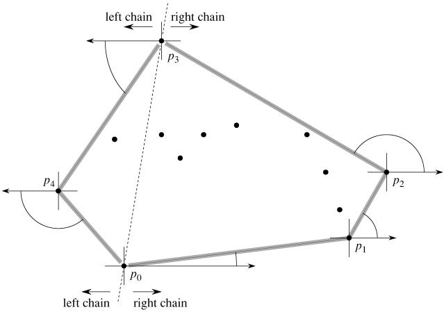 We could implement Jarvis's march in one conceptual sweep around the convex hull, that is, without separately constructing the right and left chains. Such implementations typically keep track of the angle of the last convex-hull side chosen and require the sequence of angles of hull sides to be strictly increasing (in the range of 0 to 2π radians). The advantage of constructing separate chains is that we need not explicitly compute angles; the techniques of Section 33.1 suffice to compare angles.