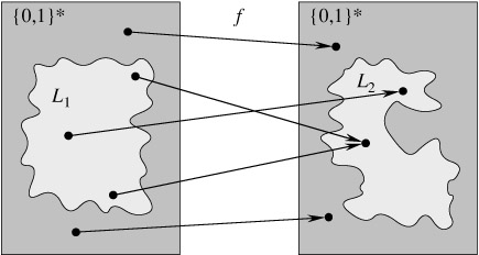 Figure 34.4 illustrates the idea of a polynomial-time reduction from a language L1 to another language L2. Each language is a subset of {0, 1}*. The reduction function f provides a polynomial-time mapping such that if x ∈ L1, then f(x) ∈ L2. Moreover, if x ∉ L1, then f (x) ∉ L2. Thus, the reduction function maps any instance x of the decision problem represented by the language L1 to an instance f (x) of the problem represented by L2. Providing an answer to whether f(x) ∈ L2 directly provides the answer to whether x ∈ L1.