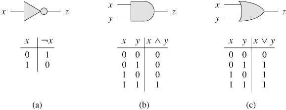 The operation of each gate, and of any boolean combinational element, can be described by a truth table, shown under each gate in Figure 34.7. A truth table gives the outputs of the combinational element for each possible setting of the inputs. For example, the truth table for the OR gate tells us that when the inputs are x = 0 and y = 1, the output value is z = 1. We use the symbols ¬ to denote the NOT function, ⊥ to denote the AND function, and ⊦ to denote the OR function. Thus, for example, 0 ⊦ = 1.