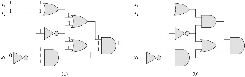 A boolean combinational circuit consists of one or more boolean combinational elements interconnected by wires. A wire can connect the output of one element to the input of another, thereby providing the output value of the first element as an input value of the second. Figure 34.8 shows two similar boolean combinational circuits; they differ in only one gate. Part (a) of the figure also shows the values on the individual wires, given the input 〈x1 = 1, x2 = 1, x3 = 0〉. Although a single wire may have no more than one combinational-element output connected to it, it can feed several element inputs. The number of element inputs fed by a wire is called the fan-out of the wire. If no element output is connected to a wire, the wire is a circuit input, accepting input values from an external source. If no element input is connected to a wire, the wire is a circuit output, providing the results of the circuit's computation to the outside world. (An internal wire can also fan out to a circuit output.) For the purpose of defining the circuit-satisfiability problem, we limit the number of circuit outputs to 1, though in actual hardware design, a boolean combinational circuit may have multiple outputs.