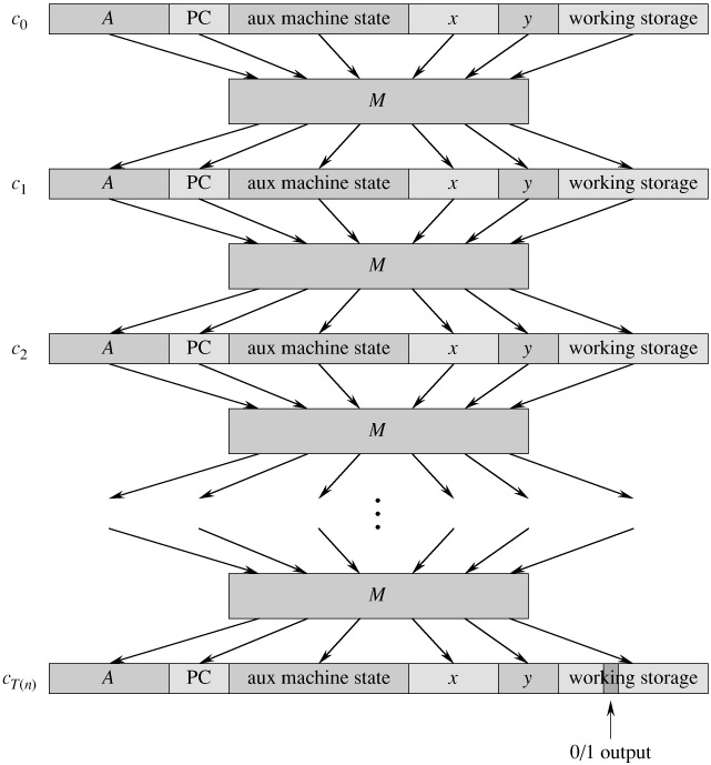 The basic idea of the proof is to represent the computation of A as a sequence of configurations. As shown in Figure 34.9, each configuration can be broken into parts consisting of the program for A, the program counter and auxiliary machine state, the input x, the certificate y, and working storage. Starting with an initial configuration c0, each configuration ci is mapped to a subsequent configuration ci+1 by the combinational circuit M implementing the computer hardware. The output of the algorithm A-0 or 1-is written to some designated location in the working storage when A finishes executing, and if we assume that thereafter A halts, the value never changes. Thus, if the algorithm runs for at most T(n) steps, the output appears as one of the bits in cT (n).