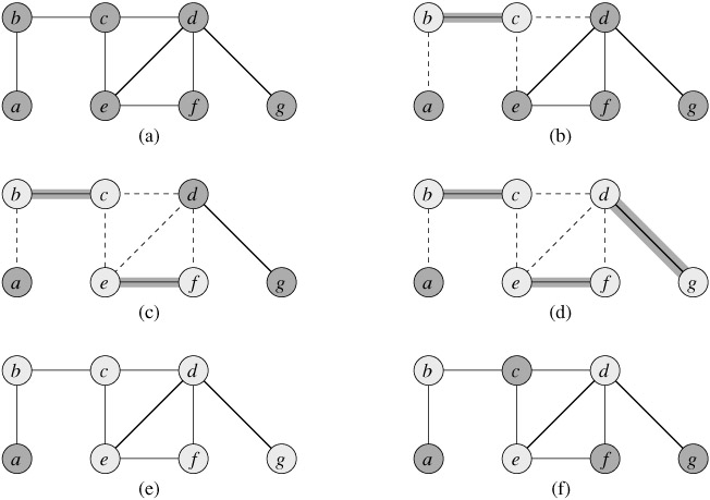 Figure 35.1 illustrates the operation of APPROX-VERTEX-COVER. The variable C contains the vertex cover being constructed. Line 1 initializes C to the empty set. Line 2 sets E′ to be a copy of the edge set E[G] of the graph. The loop on lines 3-6 repeatedly picks an edge (u, v) from E′, adds its endpoints u and v to C, and deletes all edges in E′ that are covered by either u or v. The running time of this algorithm is O(V + E), using adjacency lists to represent E′.