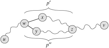 Proof (1) → (2): Since a tree is connected, any two vertices in G are connected by at least one simple path. Let u and v be vertices that are connected by two distinct simple paths p1 and p2, as shown in Figure B.5. Let w be the vertex at which the paths first diverge; that is, w is the first vertex on both p1 and p2 whose successor on p1 is x and whose successor on p2 is y, where x ≠ y. Let z be the first vertex at which the paths reconverge; that is, z is the first vertex following w on p1 that is also on p2. Let p' be the subpath of p1 from w through x to z, and let p'' be the subpath of p2 from w through y to z. Paths p' and p" share no vertices except their endpoints. Thus, the path obtained by concatenating p' and the reverse of p" is a cycle. This contradicts our assumption that G is a tree. Thus, if G is a tree, there can be at most one simple path between two vertices.